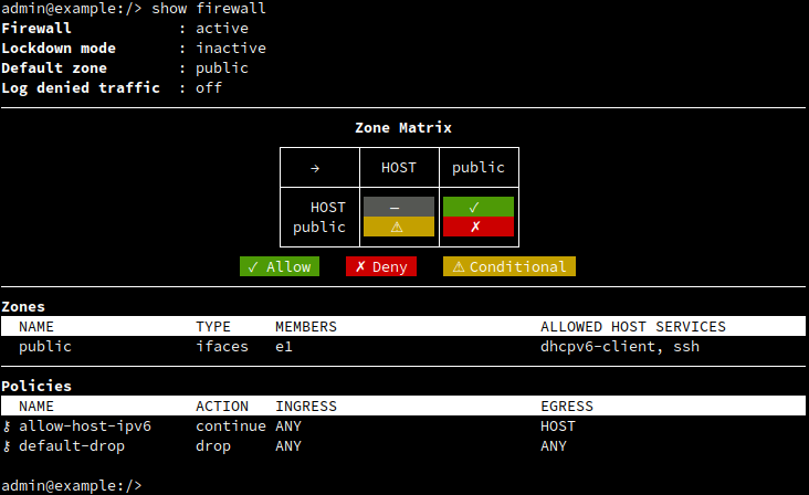CLI, when first enabling the firewall, a public zone is created. See more