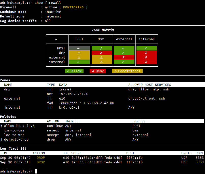 admin@example:/config/firewall/…/dmz/> set action drop