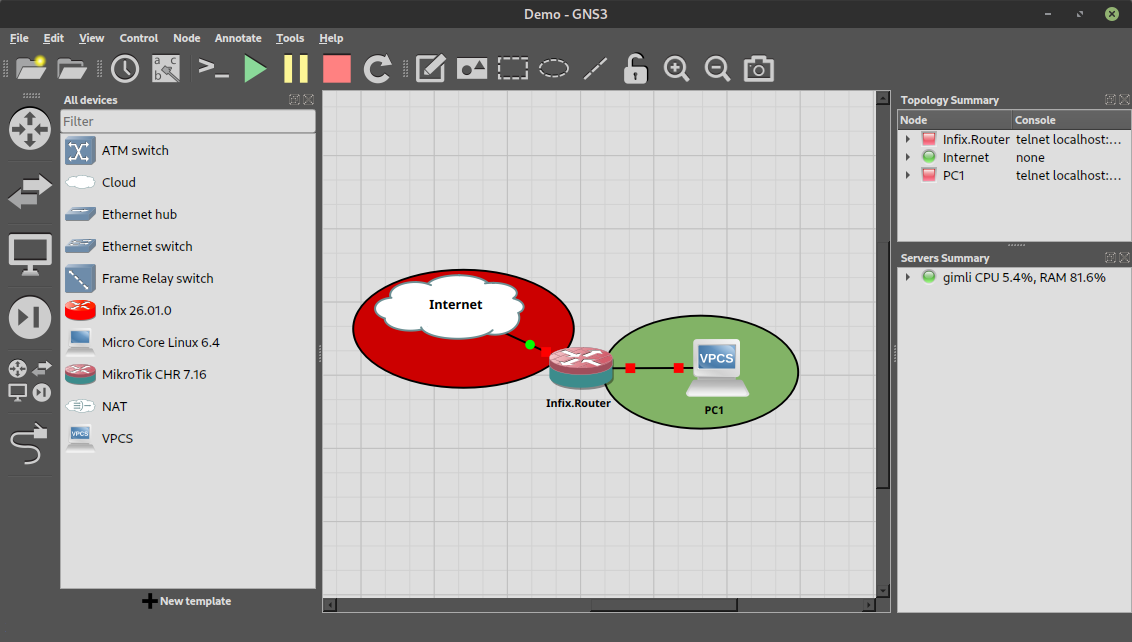 This post walks you through getting Infix running in GNS3, from installation to your first working topology.